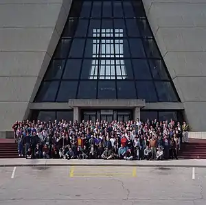 One of CDF's most famous discoveries is the observation of the top quark in February 1995.[11] The existence of the top quark was hypothesized after the observation of the Upsilon at Fermilab in 1977, which was found to consist of a bottom quark and an anti-bottom quark. The Standard Model, the most widely accepted theory describing particles and their interactions, predicted the existence of three generations of quarks.[12] The first generation quarks are the up and down quarks, second generation quarks are strange and charm, and third generation are top and bottom. The existence of the bottom quark solidified physicists' conviction that the top quark existed.[13] The top quark was the last of the quarks to be observed, mostly due to its comparatively high mass. Whereas the masses of the other quarks range from .005 GeV (up quark) to 4.7GeV (bottom quark), the top quark has a mass of 175 GeV.[14] Only Fermilab's Tevatron had the energy capability to produce and detect top anti-top pairs. The large mass of the top quark caused the top quark to decay almost instantaneously, within the order of 10−25 seconds, making it extremely difficult to observe. The Standard Model predicts that the top quark may decay leptonically into a bottom quark and a W boson. This W boson may then decay into a lepton and neutrino (t→Wb→ѵlb). Therefore, CDF worked to reconstruct top events, looking specifically for evidence of bottom quarks, W bosons neutrinos. Finally in February 1995, CDF had enough evidence to say that they had "discovered" the top quark.[15] On February 24, CDF and DØ experimenters simultaneously submitted papers to Physical Review Letters describing the observation of the top quark. The two collaborations announced the discovery publicly at a seminar at Fermilab on March 2 and the papers were published on April 3.[16]