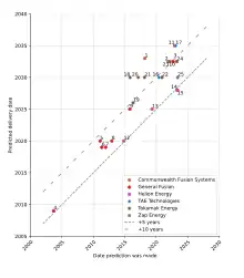 For decades researchers have famously said that fusion power is always 30, or even 50, years away.[44][45] The advent of commercial fusion has changed that, and now fusion power is typically predicted to be around 10 years away, with most companies predicting that the first fusion plant will deliver electricity to the grid before 2035.[46] Although the majority of the companies have only existed for a few years, some have already failed to deliver on their predictions. General Fusion first predicted that it would deliver electricity to the grid by 2009.[47]