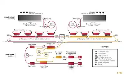 The electrons needed for the main beam are produced by illuminating a GaAs-type cathode with a Q-switched polarised laser, and are longitudinally polarised at the level of 80%.[5] The positrons for the main beam are produced by sending a 5 GeV electron beam on a tungsten target. After an initial acceleration up to 2.86 GeV, both electrons and positrons enter damping rings for emittance reduction by radiation damping. Both beams are then further accelerated to 9 GeV in a common booster linac. Long transfer lines transport the two beams to the beginning of the main linacs where they are accelerated up to 1.5 TeV before going into the Beam Delivery System (BDS), which squeezes and brings the beams into collision. The two beams collide at the IP with 20 mrad crossing angle in the horizontal plane.[5]