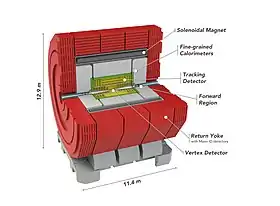 These inner CLICdet layers are enclosed in a superconducting solenoid magnet with a field strength of 4 T. This magnetic field bends charged particles, allowing for momentum and charge measurements. The magnet is then surrounded by an iron yoke which would contain large area detectors for muon identification.[19]