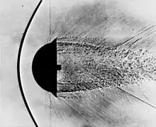 ![]() Attached shock wave shown on a X-15 Model in a supersonic wind tunnel |