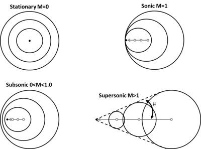 As an object accelerates from subsonic toward supersonic speed in a gas, different types of wave phenomena occur. To illustrate these changes, the next figure shows a stationary point (M = 0) that emits symmetric sound waves. The speed of sound is the same in all directions in a uniform fluid, so these waves are simply concentric spheres. As the sound-generating point begins to accelerate, the sound waves "bunch up" in the direction of motion and "stretch out" in the opposite direction. When the point reaches sonic speed (M = 1), it travels at the same speed as the sound waves it creates. Therefore, an infinite number of these sound waves "pile up" ahead of the point, forming a Shock wave. Upon achieving supersonic flow, the particle is moving so fast that it continuously leaves its sound waves behind. When this occurs, the locus of these waves trailing behind the point creates an angle known as the Mach wave angle or Mach angle, μ: