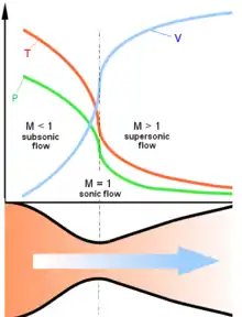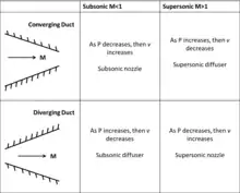 where dP is the differential change in pressure, M is the Mach number, ρ is the density of the gas, V is the velocity of the flow, A is the area of the duct, and dA is the change in area of the duct. This equation states that, for subsonic flow, a converging duct (dA < 0) increases the velocity of the flow and a diverging duct (dA > 0) decreases velocity of the flow. For supersonic flow, the opposite occurs due to the change of sign of (1 − M2). A converging duct (dA < 0) now decreases the velocity of the flow and a diverging duct (dA > 0) increases the velocity of the flow. At Mach = 1, a special case occurs in which the duct area must be either a maximum or minimum. For practical purposes, only a minimum area can accelerate flows to Mach 1 and beyond. See table of sub-supersonic diffusers and nozzles.
