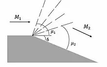 Incoming flow is first turned by angle δ with respect to the flow. This shockwave is reflected off the solid boundary, and the flow is turned by – δ to again be parallel with the boundary. It is important to note that each progressive shock wave is weaker and the wave angle is increased.