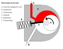 The Rolling piston in a rolling piston style compressor plays the part of a partition between the vane and the rotor.[13] Rolling piston forces gas against a stationary vane.