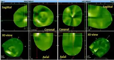 Three independent views are offered: the coronal, sagittal, and transverse views. These views can also form a composite 3D view. Since breast vasculature is arranged radially, the vessels are enlarged in a parallel view, but become narrow in a perpendicular view. An inverse factor is applied to the image so that the high vasculature areas appear white on the image while the black areas are relatively avascular segments. Benign lesions and implants are usually not visualized.