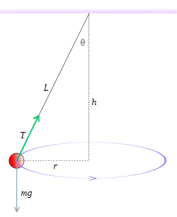 A conical pendulum consists of a weight (or bob) fixed on the end of a string or rod suspended from a pivot. Its construction is similar to an ordinary pendulum; however, instead of swinging back and forth along a circular arc, the bob of a conical pendulum moves at a constant speed in a circle or ellipse with the string (or rod) tracing out a cone. The conical pendulum was first studied by the English scientist Robert Hooke around 1660[1] as a model for the orbital motion of planets.[2] In 1673 Dutch scientist Christiaan Huygens calculated its period, using his new concept of centrifugal force in his book Horologium Oscillatorium. Later it was used as the timekeeping element in a few mechanical clocks and other clockwork timing devices.[3][4]