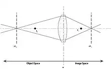 In optics, a conjugate plane or conjugate focal plane of a given plane P, is the plane P′ such that points on P are imaged on P′.[1] If an object is moved to the point occupied by its image, then the moved object's new image will appear at the point where the object originated. In other words, the object and its image are interchangeable. This comes from the principle of reversibility which states light rays will travel along the originating path if the light's direction is reversed.[2] Depending on how an optical system is designed, there can be multiple planes that are conjugate to a specific plane (e.g. intermediate and final image planes for an object plane). The points that span conjugate planes are called conjugate points.[3]