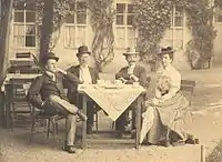 Carathéodory (left) pictured sitting with his father, brother in law and sister, Carlsbad 1898