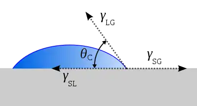 The contact angle (symbol θC) is the angle between a liquid surface and a solid surface where they meet. More specifically, it is the angle between the surface tangent on the liquid–vapor interface and the tangent on the solid–liquid interface at their intersection. It quantifies the wettability of a solid surface by a liquid via the Young equation.
