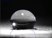 Contact angles are extremely sensitive to contamination; values reproducible to better than a few degrees are generally only obtained under laboratory conditions with purified liquids and very clean solid surfaces. If the liquid molecules are strongly attracted to the solid molecules then the liquid drop will completely spread out on the solid surface, corresponding to a contact angle of 0°. This is often the case for water on bare metallic or ceramic surfaces,[15] although the presence of an oxide layer or contaminants on the solid surface can significantly increase the contact angle. Generally, if the water contact angle is smaller than 90°, the solid surface is considered hydrophilic[16] and if the water contact angle is larger than 90°, the solid surface is considered hydrophobic. Many polymers exhibit hydrophobic surfaces. Highly hydrophobic surfaces made of low surface energy (e.g. fluorinated) materials may have water contact angles as high as ≈ 120°.[15] Some materials with highly rough surfaces may have a water contact angle even greater than 150°, due to the presence of air pockets under the liquid drop. These are called superhydrophobic surfaces.