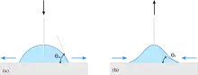 A given substrate-liquid-vapor combination yields a continuous range of contact angle values in practice. The maximum contact angle is referred to as the advancing contact angle and the minimum contact angle is referred to as the receding contact angle. The advancing and receding contact angles are measured from dynamic experiments where droplets or liquid bridges are in movement.[1] In contrast, the equilibrium contact angle described by the Young-Laplace equation is measured from a static state. Static measurements yield values in-between the advancing and receding contact angle depending on deposition parameters (e.g. velocity, angle, and drop size) and drop history (e.g. evaporation from time of deposition). Contact angle hysteresis is defined as θA – θR although the term is also used to describe the expression cos θR – cos θA. The static, advancing, or receding contact angle can be used in place of the equilibrium contact angle depending on the application. The overall effect can be seen as closely analogous to static friction, i.e., a minimal amount of work per unit distance is required to move the contact line.[6]