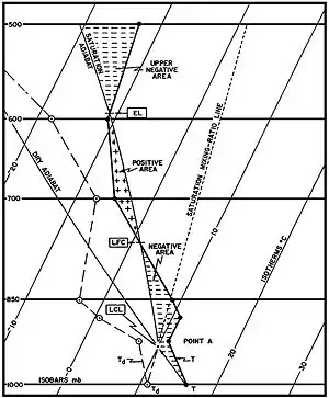 On a sounding diagram, CAPE is the positive area above the LFC, the area between the parcel's virtual temperature line and the environmental virtual temperature line where the ascending parcel is warmer than the environment. Neglecting the virtual temperature correction may result in substantial relative errors in the calculated value of CAPE for small CAPE values.[2] CAPE may also exist below the LFC, but if a layer of CIN (subsidence) is present, it is unavailable to deep, moist convection until CIN is exhausted. When there is mechanical lift to saturation, cloud base begins at the lifted condensation level (LCL); absent forcing, cloud base begins at the convective condensation level (CCL) where heating from below causes spontaneous buoyant lifting to the point of condensation when the convective temperature is reached. When CIN is absent or is overcome, saturated parcels at the LCL or CCL, which had been small cumulus clouds, will rise to the LFC, and then spontaneously rise until hitting the stable layer of the equilibrium level. The result is deep, moist convection (DMC), or simply, a thunderstorm.