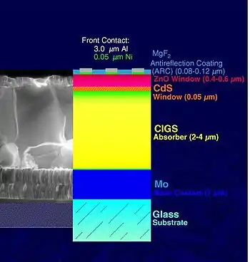 In photovoltaics "thinness" generally is in reference to so-called "first generation" high-efficiency silicon cells, which are manufactured from bulk wafers hundreds of micrometers thick.[30] Thin films sacrifice some light gathering efficiency but use less material.[31] In CIGS the efficiency tradeoff is less severe than in silicon. The record efficiencies for thin film CIGS cells are slightly lower than that of CIGS for lab-scale top performance cells. In 2008, CIGS efficiency was by far the highest compared with those achieved by other thin film technologies such as cadmium telluride photovoltaics (CdTe) or amorphous silicon (a-Si).[21] CIS and CGS solar cells offer total area efficiencies of 15.0% and 9.5%,[32] respectively. In 2015, the gap with the other thin film technologies has been closed, with record cell efficiencies in laboratories of 21.5% for CdTe (FirstSolar) and 21.7% for CIGS (ZSW). (See also NREL best research cell efficiency chart.[33])