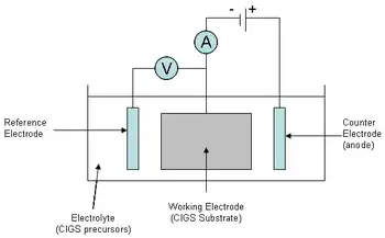 Simultaneous deposition employs a working electrode (cathode), a counter electrode (anode), and a reference electrode as in Figure 4. A metal foil substrate is used as the working electrode in industrial processes. An inert material provides the counter electrode, and the reference electrode measures and controls the potential. The reference electrode allows the process to be performed potentiostatically, allowing control of the substrate's potential.[12]