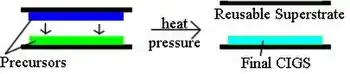 In this process, two different precursor films are deposited separately on a substrate and a superstrate. The films are pressed together and heated to release the film from the reusable superstrate, leaving a CIGS absorber on the substrate (Figure 5). Heliovolt patented this procedure and named it the FASST process. In principle, the precursors can be deposited at low temperature using low-cost deposition techniques, lowering module cost. However, the first generations of products use higher temperature PVD methods and do not achieve full cost cutting potential. Flexible substrates could eventually be used in this process.