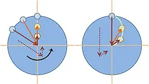 On the left, two arrows locate the ball relative to the ball-thrower. One of these arrows is from the thrower to the center of the carousel (providing the ball-thrower's line of sight), and the other points from the center of the carousel to the ball. (This arrow gets shorter as the ball approaches the center.) A shifted version of the two arrows is shown dotted.