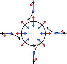 Schematic representation of flow around a low-pressure area in the Northern Hemisphere. The Rossby number is low, so the centrifugal force is virtually negligible. The pressure-gradient force is represented by blue arrows, the Coriolis acceleration (always perpendicular to the velocity) by red arrows