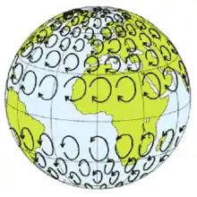 Consider a location with latitude φ on a sphere that is rotating around the north–south axis. A local coordinate system is set up with the x axis horizontally due east, the y axis horizontally due north and the z axis vertically upwards. The rotation vector, velocity of movement and Coriolis acceleration expressed in this local coordinate system (listing components in the order east (e), north (n) and upward (u)) are:[34]