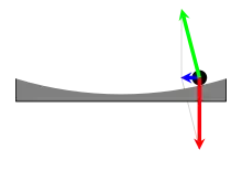 In the inertial frame of reference (upper part of the picture), the black ball moves in a straight line. However, the observer (red dot) who is standing in the rotating/non-inertial frame of reference (lower part of the picture) sees the object as following a curved path due to the Coriolis and centrifugal forces present in this frame.[1]