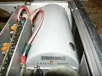 A crystal oven is a temperature-controlled chamber used to maintain the quartz crystal in electronic crystal oscillators at a constant temperature, in order to prevent changes in the frequency due to variations in ambient temperature. An oscillator of this type is known as an oven-controlled crystal oscillator (OCXO, where "XO" is an old abbreviation for "crystal oscillator".) This type of oscillator achieves the highest frequency stability possible with a crystal. They are typically used to control the frequency of radio transmitters, cellular base stations, military communications equipment, and for precision frequency measurement.
