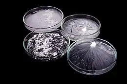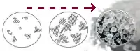 Secondary nucleation is the formation of nuclei attributable to the influence of the existing microscopic crystals in the magma.[5] Simply put, secondary nucleation is when crystal growth is initiated with contact of other existing crystals or "seeds".[6] The first type of known secondary crystallization is attributable to fluid shear, the other due to collisions between already existing crystals with either a solid surface of the crystallizer or with other crystals themselves. Fluid-shear nucleation occurs when liquid travels across a crystal at a high speed, sweeping away nuclei that would otherwise be incorporated into a crystal, causing the swept-away nuclei to become new crystals. Contact nucleation has been found to be the most effective and common method for nucleation. The benefits include the following:[5]