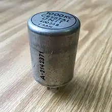 A 1 MHz military-grade crystal resonator with an octal base, marked "1000 KC" for 1000 kilocycles per second.