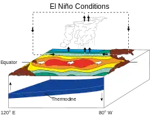 This expansion of tropical cyclone activity would bring tropical cyclones within reach of zones of the ocean where sea currents below the surface transport water towards the Eastern Pacific.[31] Tropical cyclones induce mixing of the sea surface waters;[28] with a tenfold increase in ocean mixing within two bands 8–40° north and south of the equator – especially mixing occurring in the Central Pacific where tropical cyclone activity is low under present-day climate – heat would be introduced into these sea currents and eventually lead to a warming of the central and eastern Pacific Ocean similar to El Niño and a warming of the upwelling regions,[31] with a warming of about 2–3 °C (3.6–5.4 °F) in the zone of the East Pacific cold tongue.[22] This effect can take up to a century to set in and its strength is dependent on the exact pattern of ocean mixing. It is also subject to positive feedback, as the warming of the eastern Pacific in turn increases tropical cyclone activity; eventually a climate state featuring a permanent El Niño and a weaker El Niño Southern Oscillation can arise.[32]