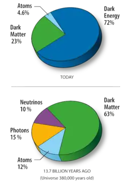 The existence of dark energy, in whatever form, is needed to reconcile the measured geometry of space with the total amount of matter in the universe. Measurements of cosmic microwave background anisotropies indicate that the universe is close to flat. For the shape of the universe to be flat, the mass–energy density of the universe must be equal to the critical density. The total amount of matter in the universe (including baryons and dark matter), as measured from the cosmic microwave background spectrum, accounts for only about 30% of the critical density. This implies the existence of an additional form of energy to account for the remaining 70%.[29] The Wilkinson Microwave Anisotropy Probe (WMAP) spacecraft seven-year analysis estimated a universe made up of 72.8% dark energy, 22.7% dark matter, and 4.5% ordinary matter.[4] Work done in 2013 based on the Planck spacecraft observations of the cosmic microwave background gave a more accurate estimate of 68.3% dark energy, 26.8% dark matter, and 4.9% ordinary matter.[35]