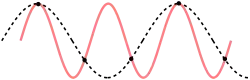 with being the mass of each atom, the spring constant for the harmonic oscillator, and still being the spacing between atoms in the ground state. After plotting this relation, Debye's estimation of the cut-off wavelength based on the linear assumption remains accurate, because for every wavenumber bigger than (that is, for is smaller than ), a wavenumber that is smaller than could be found with the same angular frequency. This means the resulting physical manifestation for the mode with the larger wavenumber is indistinguishable from the one with the smaller wavenumber. Therefore, the study of the dispersion relation can be limited to the first Brillouin zone without any loss of accuracy or information.[17] This is possible because the system consists of discretized points, as is demonstrated in the animated picture. Dividing the dispersion relation by and inserting for , we find the speed of a wave with to be
