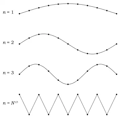 It is reasonable to assume that the minimum wavelength of a phonon is twice the atomic separation, as shown in the lowest example. With atoms in a cubic solid, each axis of the cube measures as being atoms long. Atomic separation is then given by , and the minimum wavelength is