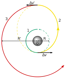 The simplest delta-v budget can be calculated with Hohmann transfer, which moves from one circular orbit to another coplanar circular orbit via an elliptical transfer orbit. In some cases a bi-elliptic transfer can give a lower delta-v.