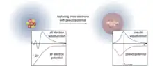 Pseudopotential representing the effective core charge. The physical image of the system with the accurate wavefunction and potential is replaced by a pseudo-wavefunction and a pseudopotential up to a cutoff value. In the image on the right, core electrons and atomic core are considered as the effective core in DFT calculations