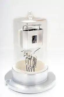 A deuterium lamp uses a tungsten filament and anode placed on opposite sides of a nickel box structure designed to produce the best output spectrum. Unlike an incandescent bulb, the filament is not the source of light in deuterium lamps. Instead an arc is created from the filament to the anode, a similar process to arc lamps. Because the filament must be very hot before it can operate, it is heated for approximately 20 seconds before use. Because the discharge process produces its own heat, the heater is turned down after discharge begins. Although firing voltages are 300 to 500 volts, once the arc is created voltages drop to around 100 to 200 volts. [1]