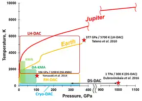 During the following decades DACs have been successively refined, the most important innovations being the use of gaskets and the ruby pressure calibration. The DAC evolved to be the most powerful lab device for generating static high pressure.[15] The range of static pressure attainable today extends to 640 GPa, much higher than the estimated pressures at the Earth's center (~360 GPa).[16]