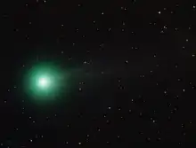 The light of gas-rich comets mainly originates from the emission of diatomic carbon. An example is C/2014 Q2 (Lovejoy), where there are several lines of C2 light, mostly in the visible spectrum[10] , forming the Swan bands.[11] C/2022 E3 (ZTF), visible in early 2023, also exhibits green color due to the presence of diatomic carbon.[12]