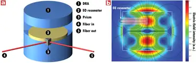 The basic concept of this photonic-assisted all-dielectric RF front-end technology is shown in Fig. 1. The Dielectric Resonator Antenna (DRA) in the front-end, functions as a concentrator of incoming electromagnetic field. When the electromagnetic (EM) field excites the resonance of DRA, a mode field pattern is built up inside the structure. The EO resonator is placed at the location of the peak field magnitude (Fig. 2). The EO resonator converts the received EM signal to an intensity modulated optical signal which is then carried away from the antenna front-end via an optical fiber. At the remote location, the signal is converted back to an RF signal which is then amplified and processed using conventional techniques. This front-end design significantly increases the threshold for damage associated with high power microwave signals. The lack of metal interconnects eliminates the one source of failure. In addition, the charge isolation provided by the optical link protects the electronic circuitry. Good sensitivity can be achieved due to signal enhancement provided by the microwave resonance in the DRA and optical resonance in the EO resonator. The modulating E-field (ERF) applied to the resonator should not be uniform across the disk otherwise no modulation occurs. To prevent this from happening, the EO resonator is placed off center from the symmetrical axis of DRA as shown in Fig. 2. The location of the EO resonator is chosen to coincide with the peak EM field inside the DRA, which is identified using 3-D EM simulations. The field profile shown in Figure 2b does not include the presence of EO resonator. In practice the presence of the EO crystal will change the field distribution.