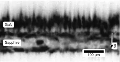 An enlarged synchrotron X-ray transmission section topograph on the right shows a diffraction image of the section of a sample having a gallium nitride (GaN) layer grown by metal-organic vapour phase epitaxy on sapphire wafer. Both the epitaxial GaN layer and the sapphire substrate show numerous defects. The GaN layer actually consists of about 20 micrometers wide small-angle grains connected to each other. Strain in the epitaxial layer and substrate is visible as elongated streaks parallel to the diffraction vector direction. The defects on the underside of the sapphire wafer section image are surface defects on the unpolished backside of the sapphire wafer. Between the sapphire and GaN the defects are interfacial defects.