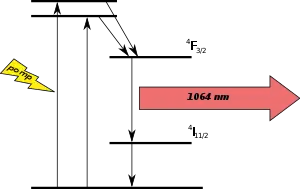 Another method is to generate 1,064 and 1,319 nm light, which are summed to 589 nm.[5] This process is more efficient, with about 3% of the pump diode's power being converted to yellow light.[6]