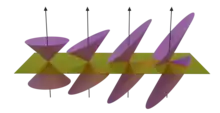 In quantum mechanics, Dirac cones are a kind of crossing-point which electrons avoid,[8] where the energy of the valence and conduction bands are not equal anywhere in two dimensional lattice k-space, except at the zero dimensional Dirac points. As a result of the cones, electrical conduction can be described by the movement of charge carriers which are massless fermions, a situation which is handled theoretically by the relativistic Dirac equation.[9] The massless fermions lead to various quantum Hall effects, magnetoelectric effects in topological materials, and ultra high carrier mobility.[10][11] Dirac cones were observed in 2008-2009, using angle-resolved photoemission spectroscopy (ARPES) on the potassium-graphite intercalation compound KC8[12] and on several bismuth-based alloys.[13][14][11]