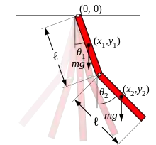 In physics and mathematics, in the area of dynamical systems, a double pendulum also known as a chaotic pendulum is a pendulum with another pendulum attached to its end, forming a simple physical system that exhibits rich dynamic behavior with a strong sensitivity to initial conditions.[1] The motion of a double pendulum is governed by a set of coupled ordinary differential equations and is chaotic.