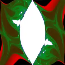 The double pendulum undergoes chaotic motion, and cleary shows a sensitive dependence on initial conditions. The image to the right shows the amount of elapsed time before the pendulum flips over, as a function of initial position when released at rest. Here, the initial value of θ1 ranges along the x-direction from −3.14 to 3.14. The initial value θ2 ranges along the y-direction, from −3.14 to 3.14. The colour of each pixel indicates whether either pendulum flips within: