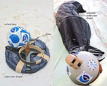 The major components of a drifter include surface floats for buoyancy, underwater drogues to ensure the drifter follows the movements of the water and is unaffected by wind, instruments (e.g., data collecting instruments, transmitters to transmit the collected data, and GPS devices), and waterproof containers for instruments.[3][4] Drifters are a technological evolution of ocean current analysis historically performed through drift bottle experiments, which in turn were built on the principle of a message in a bottle.[5]