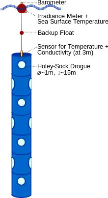 Deepwater drifters are typically called SVP drifters because they were developed by the Surface Velocity Program (SVP) of the Tropical Ocean Global Atmosphere (TOGA) experiment and the World Ocean Circulation Experiment.[12] They are also called "holey sock" type drifters.[10] They consist of a surface float, a tether, and a drogue. The surface float contains a battery, instruments that collect data like temperature, barometric pressure, wind speed and direction, and ocean salinity, and a transmitter that relays the position of the drifting buoy and data collected by the instruments on the surface float to satellites. The tether connects the surface buoy to the subsurface drogue. And the drogue is a canvas-covered cylindrical frame with holes in it that sits at about 15 meters below the ocean’s surface. Because the drifter sits at this depth, its movement is influenced by processes occurring in the upper 15 meters of the ocean.[13]