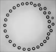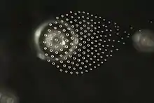 Droplet cluster is a self-assembled levitating monolayer of microdroplets usually arranged into a hexagonally ordered structure over a locally heated thin (about 1 mm) layer of water. The droplet cluster is typologically similar to colloidal crystals. The phenomenon was observed for the first time in 2004,[1] and it has been extensively studied after that.[2][3]