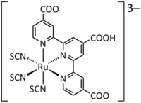 The dyes used in early experimental cells (circa 1995) were sensitive only in the high-frequency end of the solar spectrum, in the UV and blue. Newer versions were quickly introduced (circa 1999) that had much wider frequency response, notably "triscarboxy-ruthenium terpyridine" [Ru(4,4',4"-(COOH)3-terpy)(NCS)3], which is efficient right into the low-frequency range of red and IR light. The wide spectral response results in the dye having a deep brown-black color, and is referred to simply as "black dye".[45] The dyes have an excellent chance of converting a photon into an electron, originally around 80% but improving to almost perfect conversion in more recent dyes, the overall efficiency is about 90%, with the "lost" 10% being largely accounted for by the optical losses in top electrode.