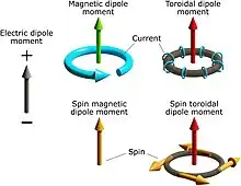 In classical electrodynamics, the dynamic toroidal dipole arises from time-dependent currents flowing along the poloidal direction on the surface of a torus.[1] In relativistic quantum mechanics, spin contributions to the toroidal dipole needs to be taken into account.[2] Toroidal dipole moments are odd under parity and time-reversal symmetries. Dynamic toroidal dipole is distinguished from the static toroidal dipole introduced by Zeldovich in 1957 under the name of static anapole.[3]