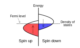 A schematic band structure for the Stoner model of ferromagnetism. An exchange interaction has split the energy of states with different spins, and states near the Fermi level are spin-polarized.