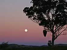Earth's shadow (or Earth shadow) is the shadow that Earth itself casts through its atmosphere and into outer space, toward the antisolar point. During the twilight period (both early dusk and late dawn), the shadow's visible fringe – sometimes called the dark segment or twilight wedge[1] – appears as a dark and diffuse band just above the horizon, most distinct when the sky is clear.