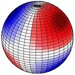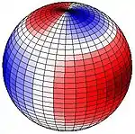 The semi-diurnal tide (one maximum every 12 or so hours) is primarily lunar (only S2 is purely solar) and gives rise to sectorial (or sectoral) deformations which rise and fall at the same time along the same longitude.[1] Sectorial variations of vertical and east-west displacements are maximum at the equator and vanish at the poles. There are two cycles along each latitude, the bulges opposite one another, and the depressions similarly opposed. The diurnal tide is lunisolar, and gives rise to tesseral deformations. The vertical and east-west movement is maximum at 45° latitude and is zero on the equator and at the poles. The tesseral variation has one cycle per latitude, one bulge and one depression; the bulges are opposed (antipodal), in other words the western part of the northern hemisphere and the eastern part of the southern hemisphere, for example. Similarly, the depressions are opposed, in this case the eastern part of the northern hemisphere and the western part of the southern hemisphere. Finally, fortnightly and semi-annual tides have zonal deformations (constant along a circle of latitude), as the Moon or Sun gravitation is directed alternately away from the northern and southern hemispheres due to tilt. There is zero vertical displacement at 35°16' latitude.
